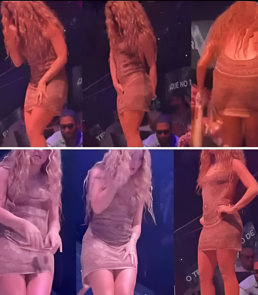 The music continues to blast out of the speakers and Shakira, seemingly frustrated, puts her hands on her hips and busts out a few more moves before once more tugging down at her hem, shaking her head and walking off stage.
